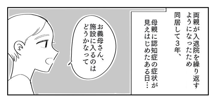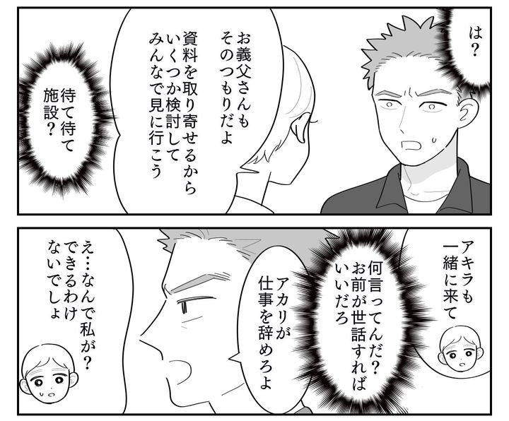 俺はアキラ(40歳)。嫁のアカリ(35歳)と子どもたち(7歳、5歳)と、俺の実家で同居をしています。両親は共に入退院を繰り返していて、母は最近になって認知症の症状もみられるように……。ある日ケアマネジャーさんから施設の検討をすすめられたと、アカリが言いだします。介護のことはアカリに一任するつもりだし、嫁が同居の義両親の介護をするのは当たり前。しかしアカリときたら、やる前から「できない」などと甘ったれたことを言うのです。