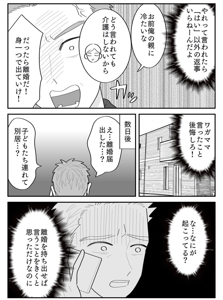 アカリの意見なんて聞いていないし、やれと言われたら「はい」と返事だけすればいいのです。自分のワガママを猛省してほしいと思い、俺は「介護しないなら離婚だ」と離婚届を突きつけました。けれどアカリには本当に離婚届を出され……。