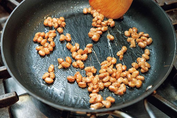 ❷フライパンにサラダ油を中火で熱し、納豆を1分いため、とき卵を流し入れて広げる。半熟のうちにごはんをのせ、へらで卵をからめながら細かく切るようにしてほぐして焼く。