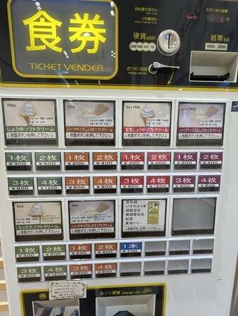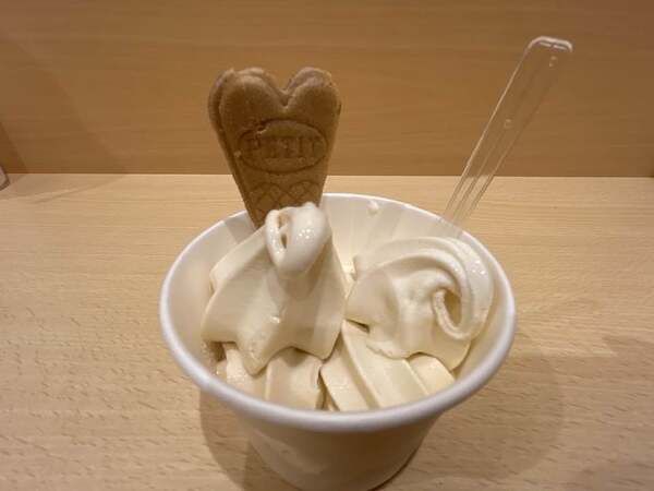 食券を買ってソフトクリームを注文します。今回は取材用として特別に「しょうゆソフトクリーム」と「豆乳ソフトクリーム」を一つの容器で提供していただきました。しょうゆ味のソフトクリーム!初めて食べましたが、とても美味しかったです。