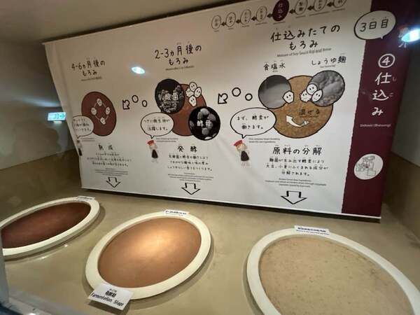 工場見学は約60分。まずは、しょうゆの製造工程やしょうゆのヒミツについて約15分の映像視聴。その後、工場内で実際の製造工程の見学や説明を通じてしょうゆができるまでを学びます。見学コースには「初期」「発酵期」「熟成期」のもろみを設置。色と香りをくらべることができます。