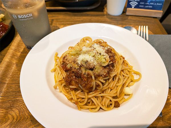 「牛すじ肉のボロネーゼパスタ」しっかりしたソースにチーズのトッピングが嬉しい