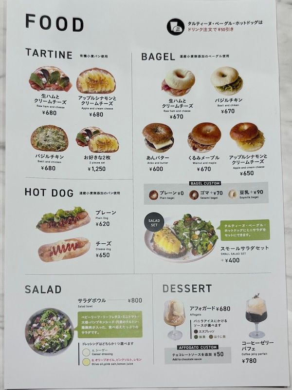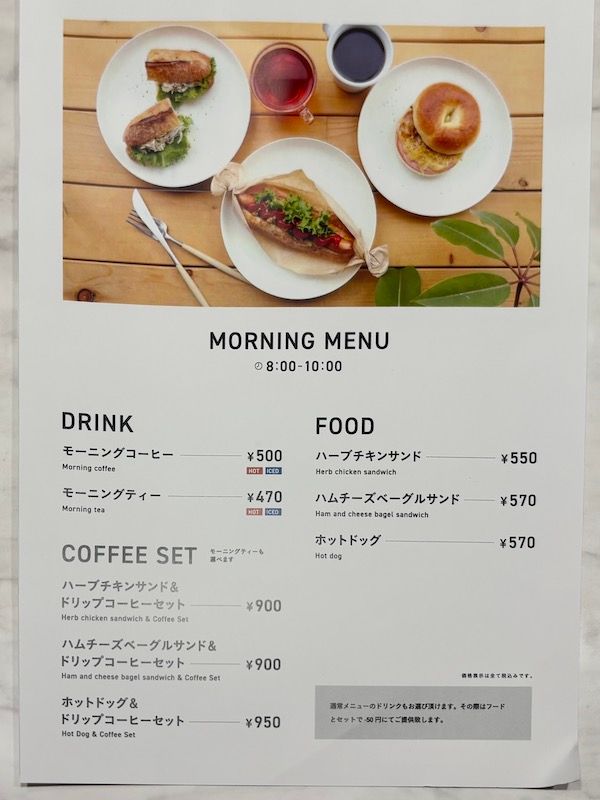 たとえばコーヒーは通常600円が500円、ホットドッグは620円が570円に!モーニング限定メニューとしてハーブチキンサンド(550円)、ハムチーズベーグルサンド(570円)も登場。