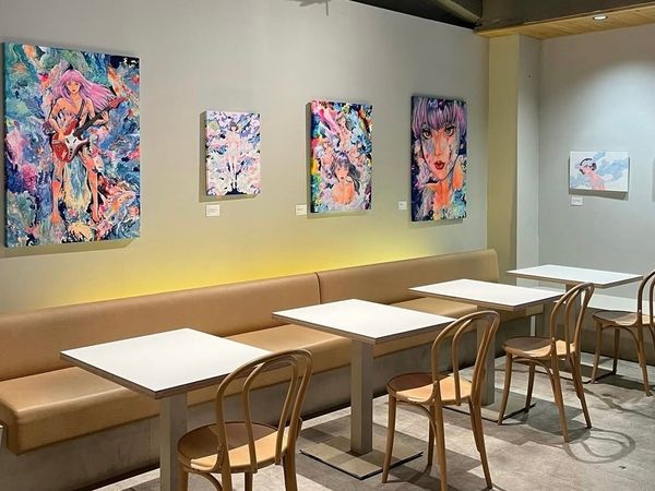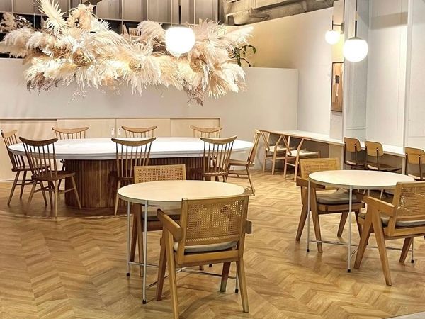 ナチュラルな雰囲気のインテリアにお花の飾りや鮮やかなアートがセンス良く彩る店内。