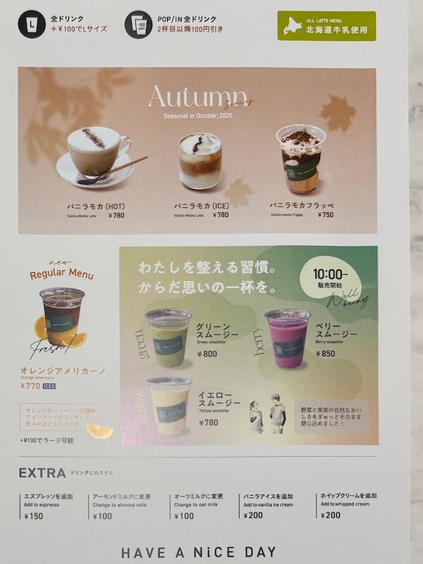 人気ナンバーワン・美瑛牛乳を使ったカフェラテをはじめ、ドリップコーヒーや季節で変わるアレンジコーヒー、紅茶、ソフトドリンクなど充実のラインナップです。
