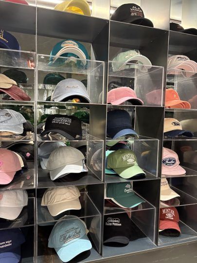 毎回、壁一面に並ぶキャップに悩みますが今回は娘に黒のキャップと自分用に三角のスカーフを購入。