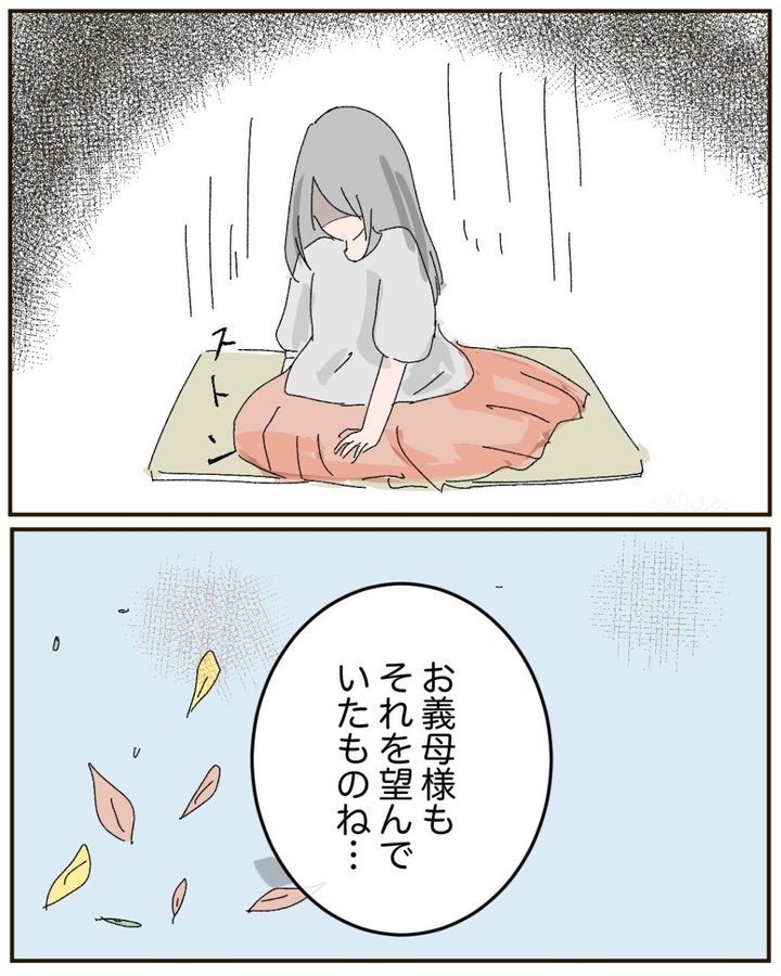 つかさが出て行ったら急に力が入らなくなり、そのばに座り込んでしまった私。義実家に、もう別の女性が住んでいるなんてショックすぎます。でもお義母様も、長男であるつかさの子供を心待ちにしていたものね。