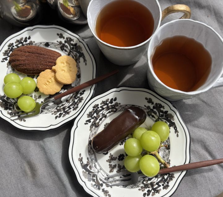 甘いものが苦手といってもチョコレートやクッキーは大好きなので、マドレーヌもエクレアもチョコ味で。そこに旬のシャインマスカットとお気に入りの紅茶を淹れれば、出来上がり。自分の好きなものを好きなだけ並べられるのは、自宅だからこその特権ですよね!