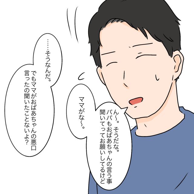 タケルさんは「ん~。そうだな。パパもおばあちゃんの言うこと聞いてってお願いしてるけど、ママがな~」と、言うことを聞かないモエさんが悪いと説明。マヒロちゃんは「・・そうなんだ。でもママがおばあちゃんの悪口言ったの聞いたことないよ?」とパパの説明にあまり納得がいかない様子。
