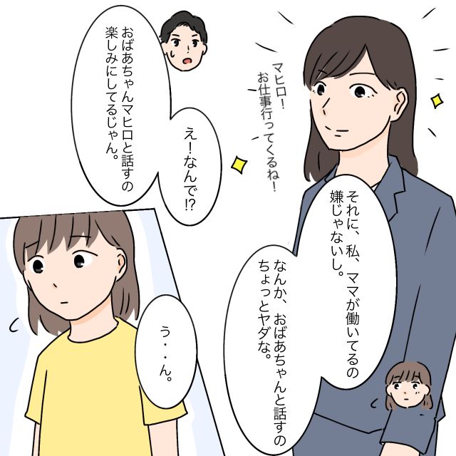 マヒロちゃんは仕事を頑張っているママが好きですが、おばあちゃんが仕事をしているママを悪く言うのでおばあちゃんと話すのが憂鬱になってしまいました。おばあちゃんからは頻繁に電話がかかってきましたが、マヒロちゃんは何かと理由をつけて電話を断ることが増えました。そんなある日、パパからおばあちゃんの家に行こうと誘われたマヒロちゃんは「行かなくてもいい?」と行きたくない気持ちを伝えますが、パパに説得され仕方なくおばあちゃんの家に行くことになってしまいました。
