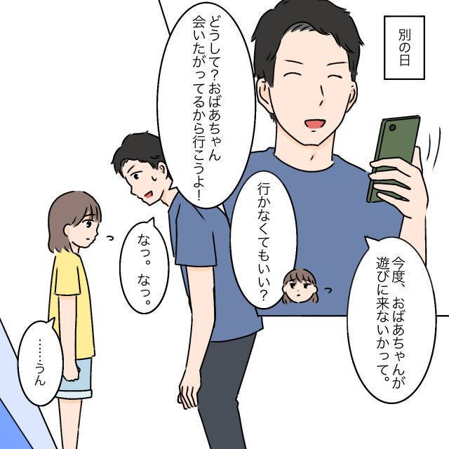 ある日、「今度、おばあちゃんが遊びに来ないかって」とパパに言われたマヒロちゃんは「行かなくてもいい?」と聞きました。タケルさんは「どうして?おばあちゃん会いたがってるから行こうよ!なっ?なっ?」と必死に説得。断り切れなかったマヒロちゃんは、気が進まないながらも「・・うん」と答えるしかありませんでした。