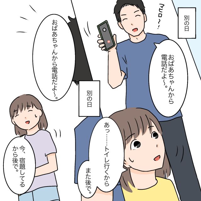 それ以降、マヒロちゃんはおばあちゃんからの電話を避けるようになりました。タケルさんが「おばあちゃんから電話だよ~」とやってくると「あっ・・トイレ行くからまた後で」と言ったり、別の日には「今、宿題してるから後で」と言ったり、何かと理由をつけてできるだけ電話に出ないようになったマヒロちゃん。