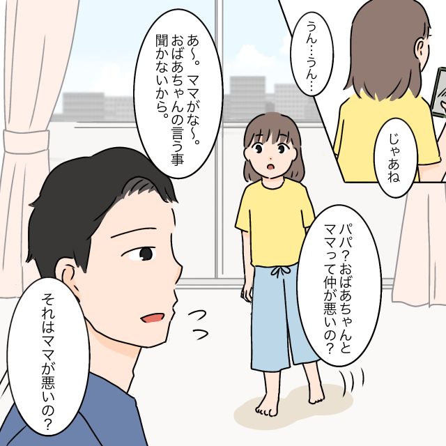 電話を切った後、マヒロちゃんが「パパ?おばあちゃんとママって仲が悪いの?」と聞くと、タケルさんは「あ~。ママがな~。おばあちゃんの言うこと聞かないから」とモエさんに原因があるかのように答えたので、マヒロちゃんは「それはママが悪いの?」と聞き返しました。