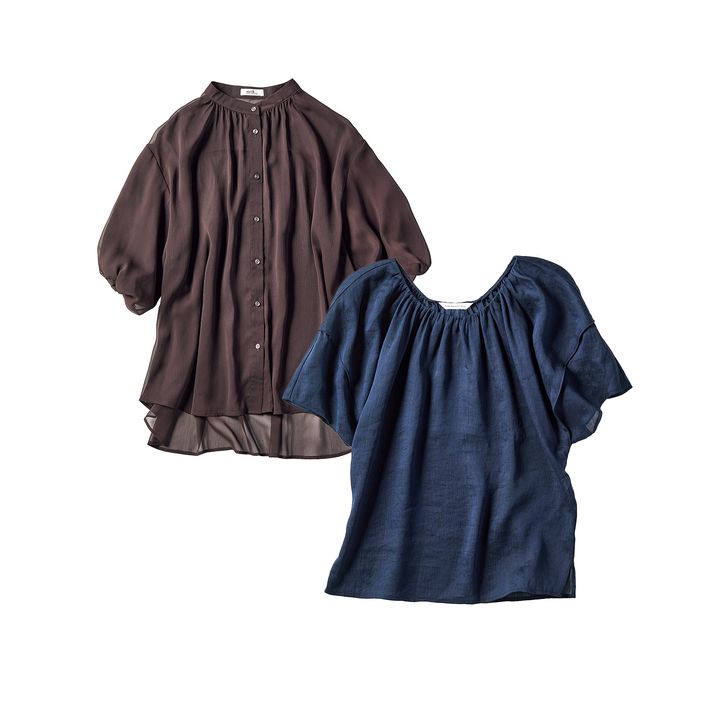 左、シアーシャツ¥4,499(アース ミュージック&エコロジー/アース ミュージック&エコロジー トーキョー 東京ソラマチ)右、ネイビーシアーリネンブラウス¥13,000(バナナ・リパブリック)