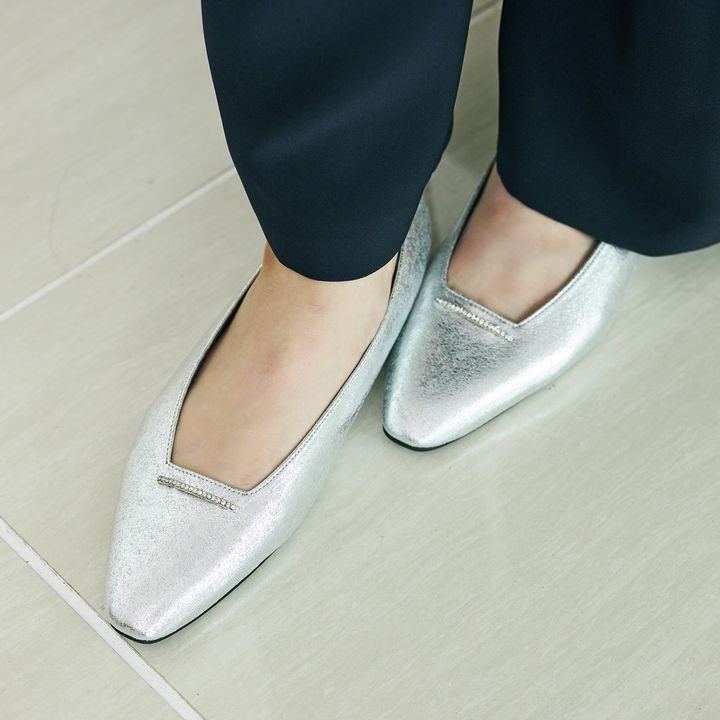 楽ちんなのにクールな華やぎを与えてくれるシルバーのフラットシューズは立食形式の同窓会の頼れる一足です。