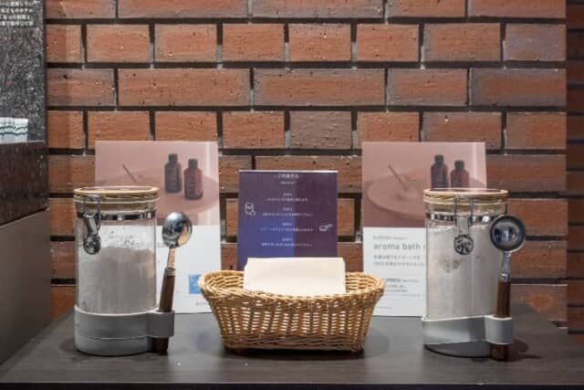 近ごろは入浴剤を用意するビジネスホテルが増えていますが、ここではガラスのびんに入った100%天然エッセンシャルオイルを配合したバスソルトがありました。カモミールやベルガモットなどを配合し、女性ホルモンのバランスを整えリラックスする「フォーストレス」と、シダーウッドやペパーミントなどを配合して脳の活動を鎮めリラックス効果がある「クールダウン」を用意します。