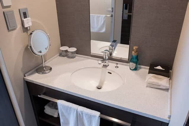 セパレートタイプの洗面は、ゆとりがあって持参したアメニティーなどを置くスペースも十分ありました。ライティングミラーが置かれているのも嬉しいポイントです。