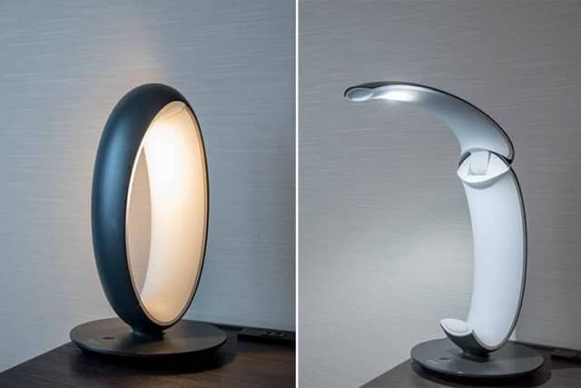 楕円形の照明は明るさの調整も可能。リング状の時は落ち着いた電球色で、展開してデスクワークに利用する時は仕事に向いた昼白色で点灯します。