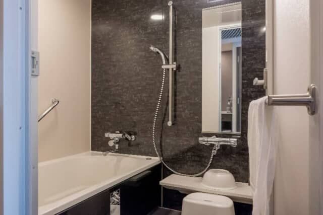 バスチェアや洗面器も用意され、まるで家庭のお風呂のように使勝手のいいバスルームです。バスタブのお湯の量も設定できるので、何度も確認に行く手間が省けます。バスソルトを入れてお風呂時間を楽しみました。