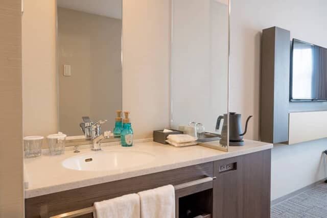 洗面には透明の仕切りが採用され、開放的があると同時に客室も広く感じられます。バルミューダのケトルも全ての客室に備えます。