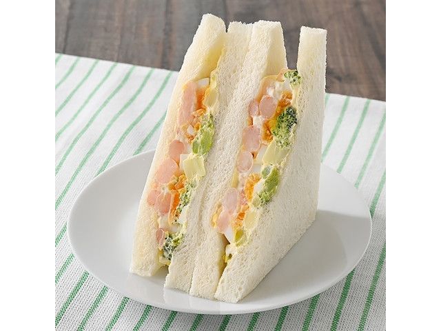 具材感のあるブロッコリータルタルサラダにゆで卵、海老を組み合わせたサンドイッチです。