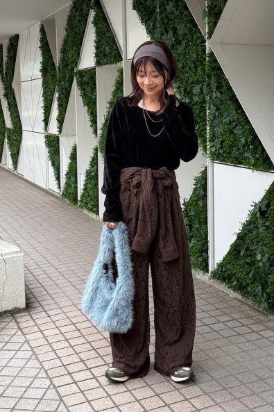 ベロアのようなヴィンテージライクな質感と、フェミニンなバックリボンのギャップが魅力。黒でも重たく見えず、秋らしいムードと洒落感を添えます。