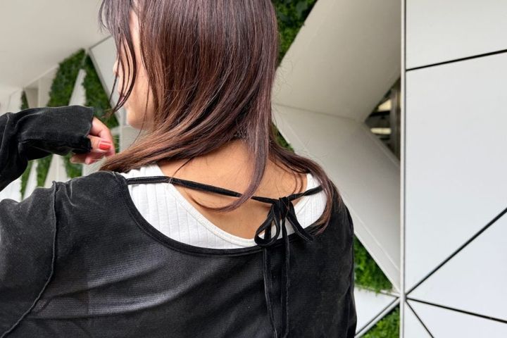 「季節感のある素材とバックリボンのデザインが特にお気に入り。リボンは背中で結ぶのはもちろん、首もとで結べばチョーカー風にもなり、アレンジできるのが楽しいです」