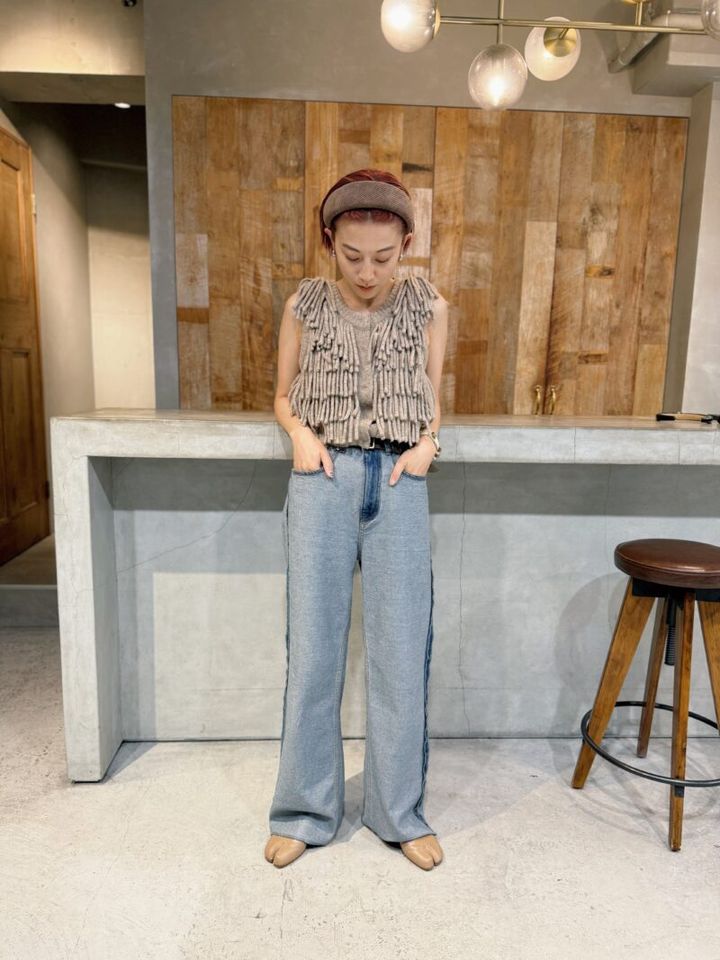 「お気に入りのroom153のデニムは、実は“裏返し“デザインなんです! かなりインパクトがあるので、全体的な色味は抑えています。トップスはクラネのニットベストで潔く。素材がよくあたたかで、フリンジ付きのデザインだから、1枚でも見劣りナシ! カチューシャやシューズもベストと同系色にして統一感を出しました」(ヘアサロンPARKオーナー 水戸怜子さん)