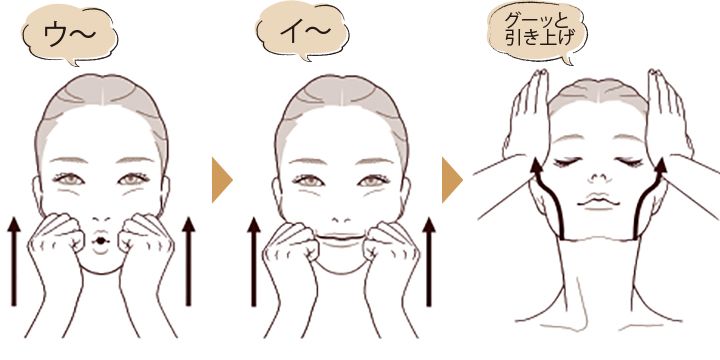 パール粒1コ分を顔全体に塗布。ウの口をして、握った指の面部分で輪郭を持ち上げます。イの口も同様に。最後に手のひらでこめかみまで肌を引き上げキープ。1分程度の簡単ケア習慣。