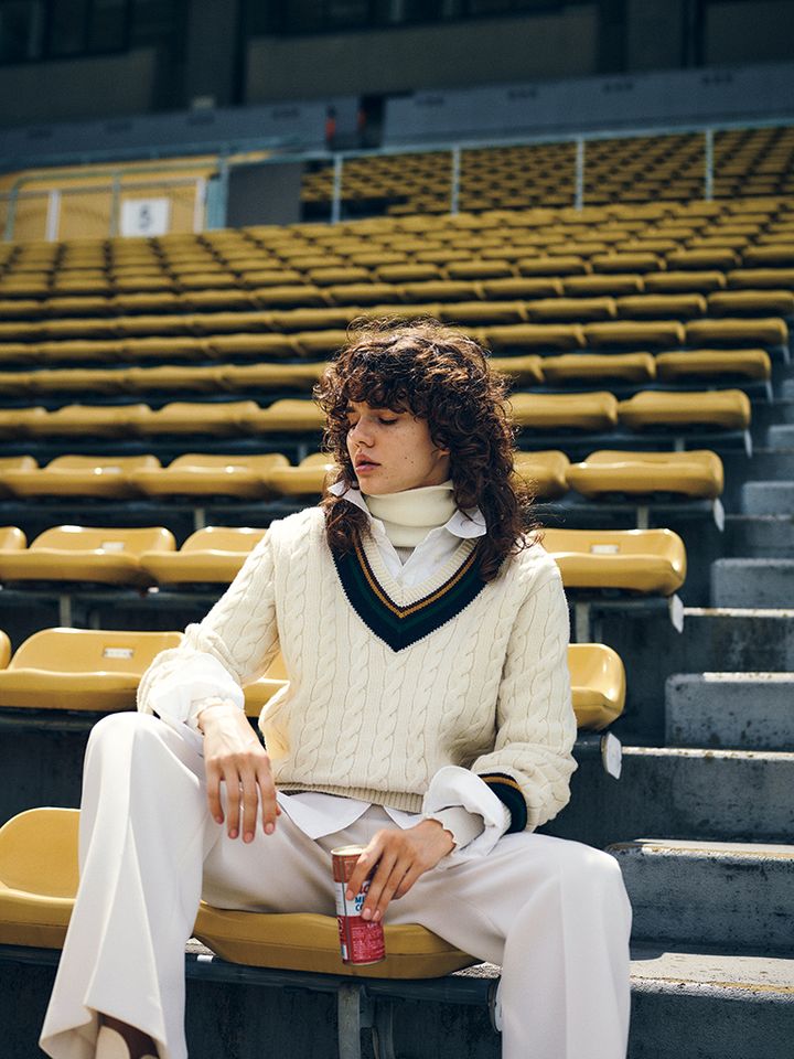 ケーブルニットのイメージを塗りかえるかのように、白に白を重ねてベーシックの刷新を。オフ白、純白など、白の微差を駆使して奥行きを意識。パリッとした白シャツのえりをわざと雑に立て、なめらかなパンツにはセンタープレスを。