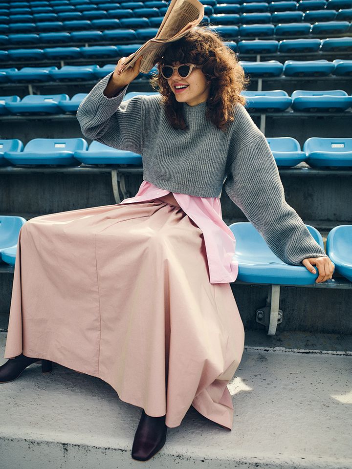 トップス丈のショート化が加速中の今、まずは無地ニットでウォーミングアップを。短め丈ニットは「どこかにゆるさ」をもたせたものを。全体的に、あるいはそでだけにゆとりを持たせるなど、重ね着にも向くタイプがベスト。