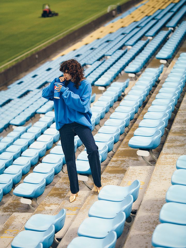 デニムの相棒として変わらずあり続ける、シンプルなスエット。そでやすそをまくって着くずしがいのある「極端に大きなスエット」を新投入。インディゴデニムをブルーの一種ととらえ、彩度に差をつけたグラデーションにも注目。
