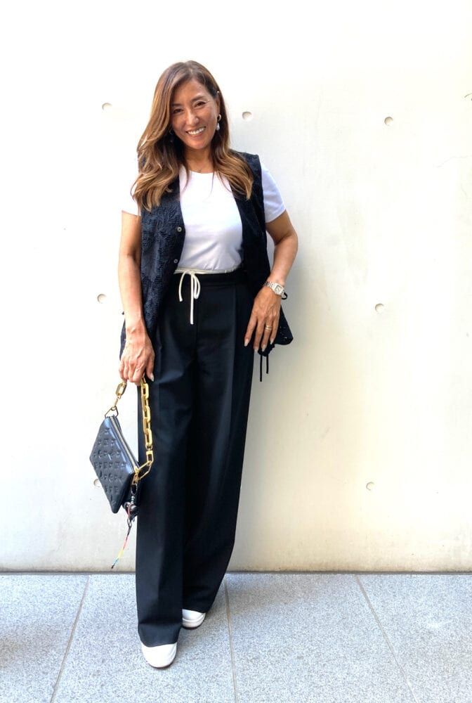 素敵なあの人のイベントに参加をしていたセリさん。「クールながら女性らしさを感じる『TOMORROWLAND』のレース生地のジレでコーディネート。ボトムは動きやすく、『ZARA』のウエストゴムのパンツで合わせました。シンプルな白Tに羽織るだけで、きちんと感が出ます」
