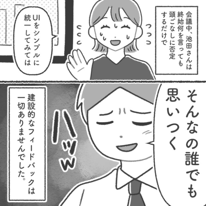 衝撃のエピソードを漫画化!今回は部下が会議で提案する内容を全て頭ごなしに否定だけする上司のお話をご紹介します。