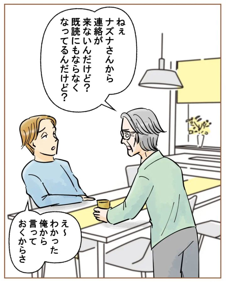その後、「ねぇ、ナズナさんから連絡が来ないんだけど?既読にもならなくなってるんだけど?」と義母がツカサに言うと、「え~わかった。俺から言っておくからさ」とツカサが答えました。