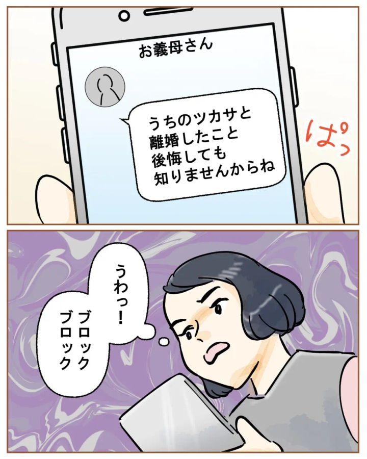 「お義母さん:うちのツカサと離婚したこと後悔しても知りませんからね」と書かれたメッセージを見て、「うわっ!ブロックブロック」と急いで義母をブロックしました。