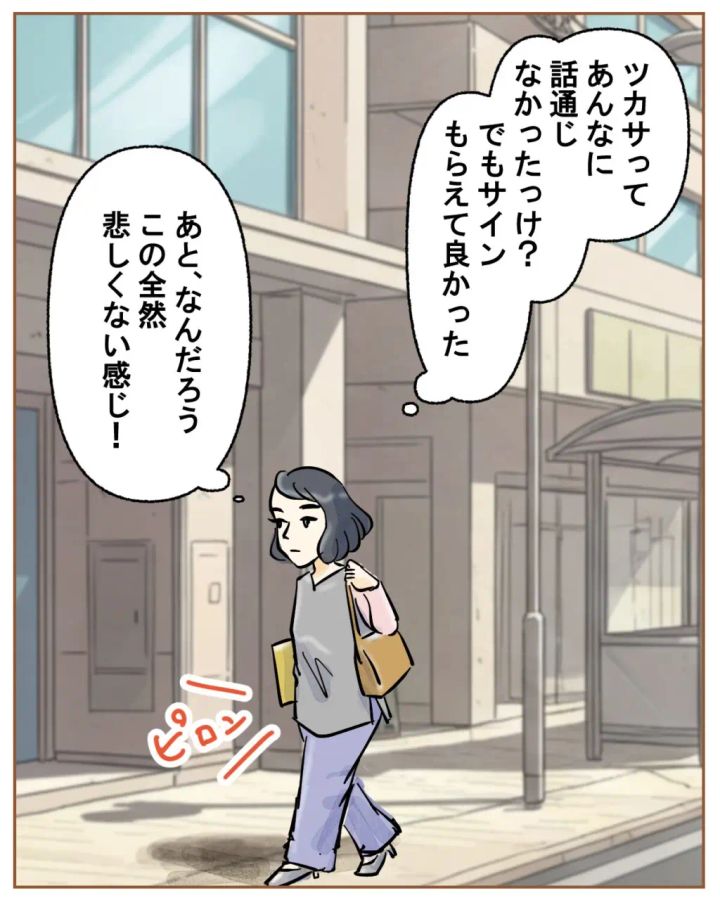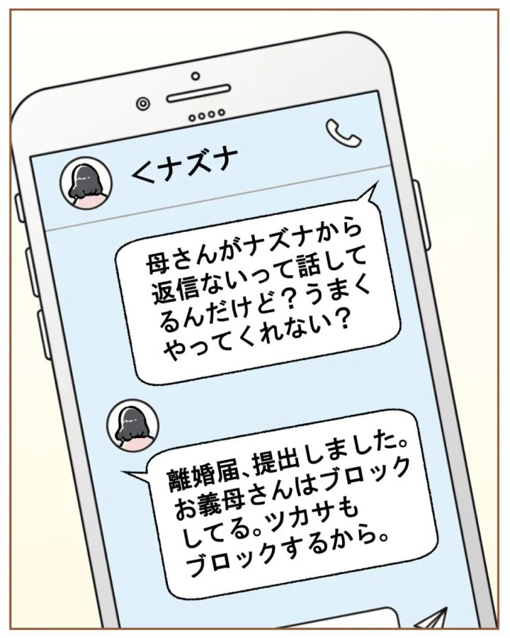 「今なら許してやる」と訳がわからないことを言うツカサさんと別れ、「あんなに話通じなかったっけ?」と思いながらも、離婚届にサインを貰えたことを喜ぶナズナさん。すぐに届いた義母からのメッセージは速攻ブロックするも、ツカサさんから「うまくやってよ」と上から目線のメッセージにうんざりしたナズナさんは、離婚届を提出したことと、義母もツカサさんもブロックするとハッキリ宣言し、スッキリ!ナズナさんはようやく自由を手にしたのですね!