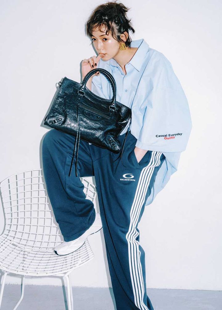 佐藤栞里。ar9月号より シャツ¥171,600、パンツ¥180,400、バッグ¥413,600、ピアス¥ 82,500、シューズ¥157,300(すべて予定価格)/バレンシアガ(バレンシアガ クライアントサービス)