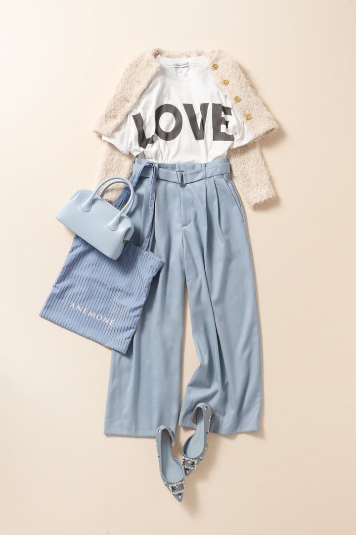 カーディガン¥35,000(シーニュ)Tシャツ¥15,400(サードマガジン×キャサリン・ハムネット/サードマガジン)パンツ¥28,600(スタニングルアー/スタニングルアー 新宿店)ハンドバッグ¥48,400(オソイ フォー ユナイテッドアローズ/オソイ 新宿)トートバッグ¥2,420(アネモネ/サンポークリエイト)シューズ¥31,900(ツル バイ マリコ オイカワ)
