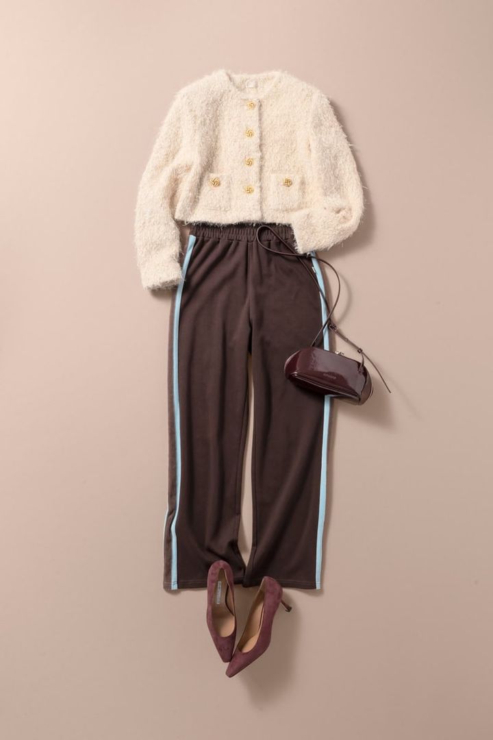 1日目はシワにならないサイドラインパンツで心身ともにリラックス。ただし、合わせ方次第でルーズに見えてしまうので、ヒールとジャケットカーディガンを合わせて大人の洗練感を意識して。