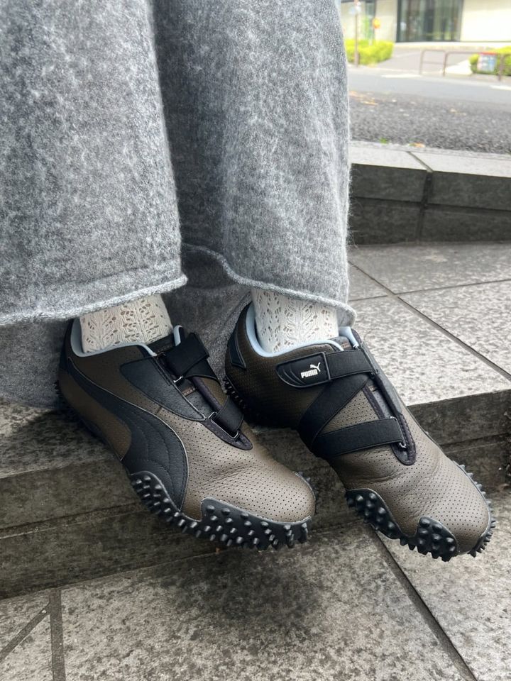 「マットブラウンのパンチングレザーアッパーと、他にない印象的なソールがお気に入りポイント。ライニングやかかとのCATロゴがアイスブルーになっていて、モードななかにヌケ感を忘れないemmiらしい別注スニーカーです」スニーカー¥15,400(emmi×PUMA/emmiニュウマン新宿)