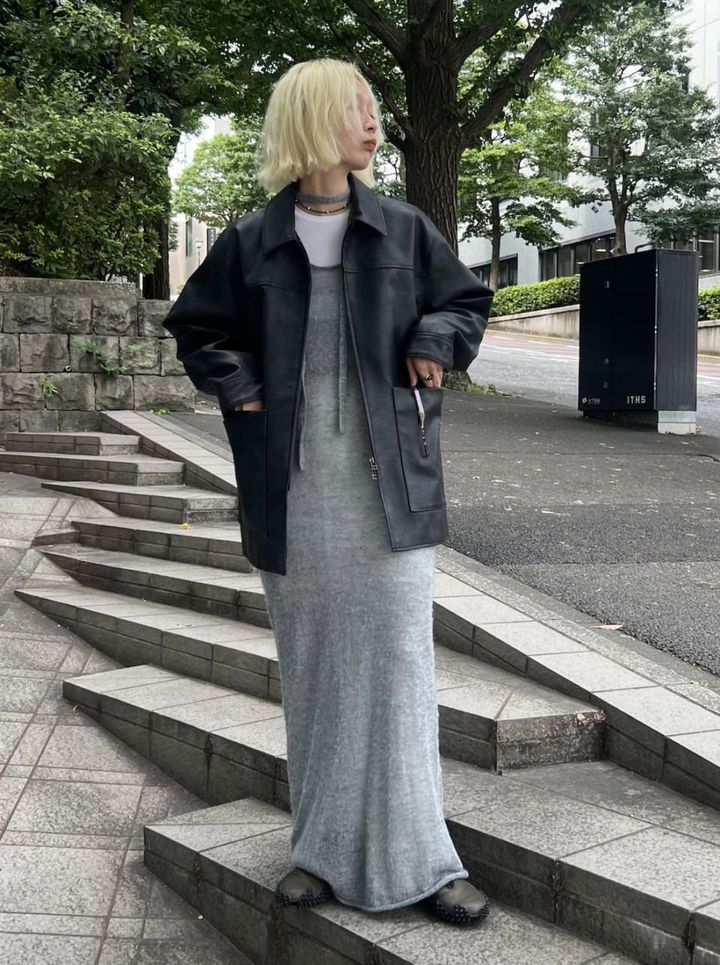 「メンズライクなフェイクレザージャケットの中に、Iラインシルエットのキャミワンピースを合わせて女性らしさを感じるスタイリングに。コーデを締めてくれるブラウンのスニーカーでトレンド感をプラスしました」