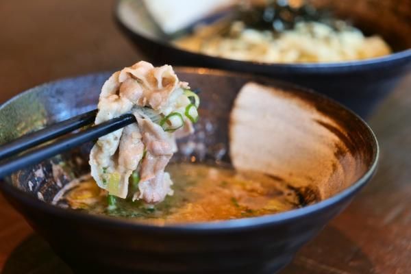 砥部店と鷹子店でしか味わえない『豚しゃぶつけ麺』は、豚骨ベース。 豚骨でとったダシに、豚バラと白ネギで甘さを出した優しい味わいです。