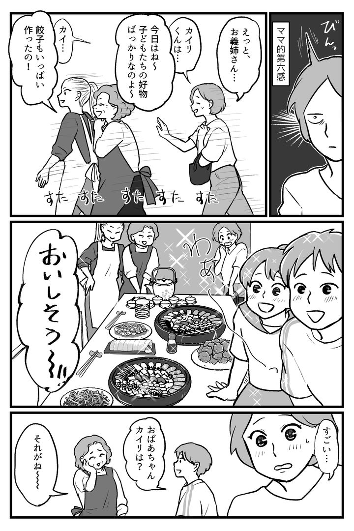 食卓には、色とりどりのおもてなし料理がずらりと並んでいます。きっと午前中は準備で大変だったと思います。ケイがなかなか姿を見せないカイリくんを心配して、義母に聞きました。