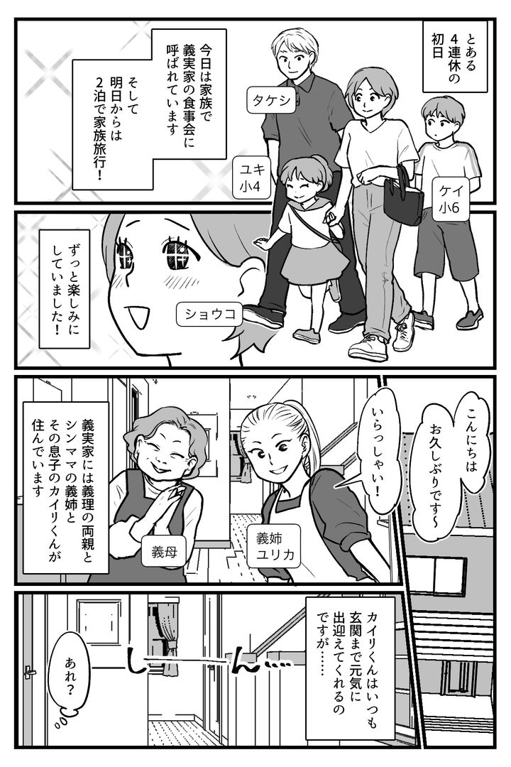 私たちが義実家へ行くといつも玄関まで飛んでくるカイリくんが今日は来ません。居間に通されて席に座っても、カイリくんの姿は見えませんでした。不思議に思っていると……。