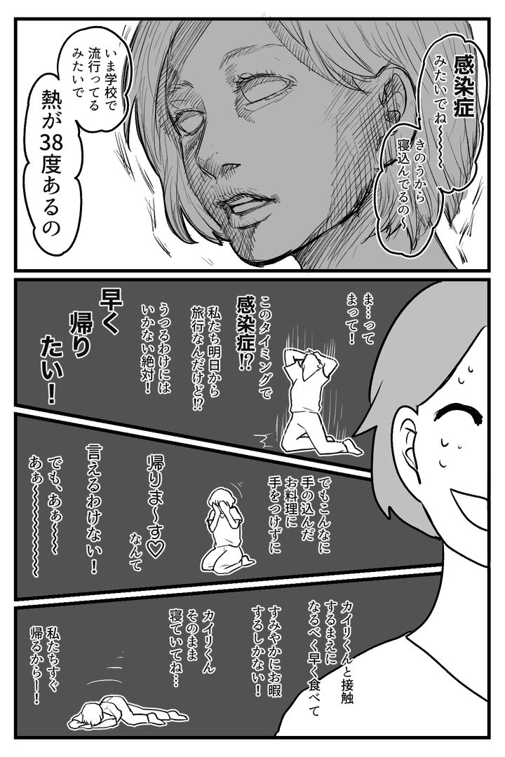 楽しく過ごすはずだった食事会。しかし、カイリくんはなんと感染症の疑いがあるとのこと。連休に入ってしまったので病院には行っていないそうですが、熱もあって咳もして……。カイリくんの通う学校では感染症が流行っているそうなので、その可能性は大なのではないでしょうか。