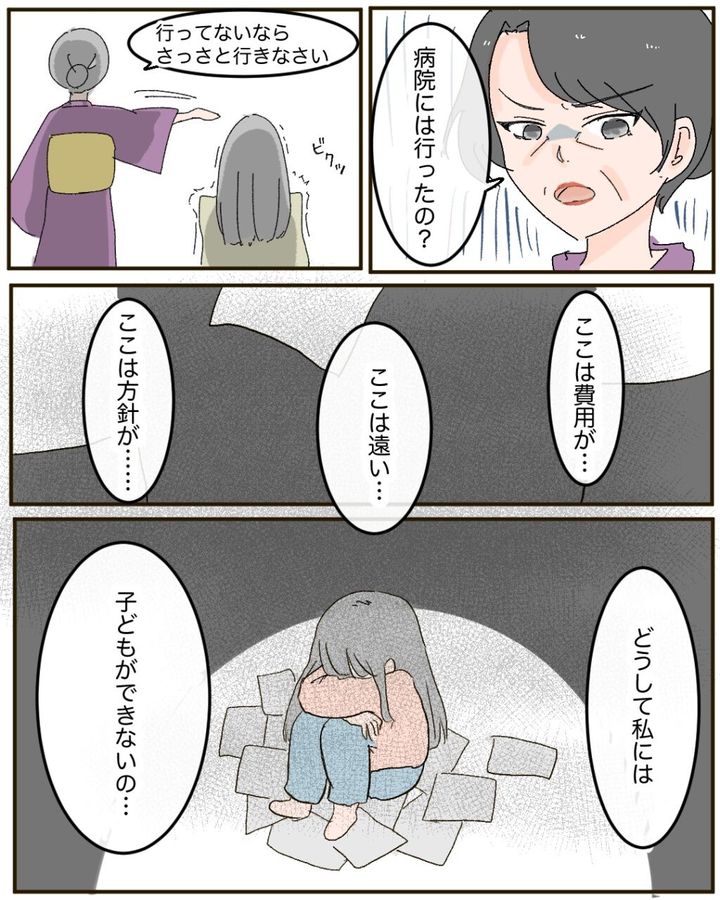 そして、「病院には行ったの?行ってないならさっさと行きなさい」と義母に言われ、病院を探すも、「ここは費用が・・」「ここは遠い・・」「ここは方針が・・」となかなか条件に合うところが見つからず、「どうして私には子どもができないの?」と考え込んでしまいました。