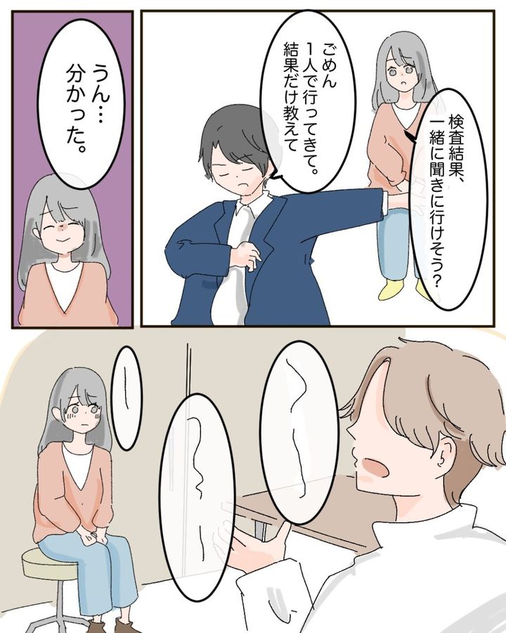 そして不妊治療を始めた私たち。検査の日には「検査結果、一緒に聞きに行けそう?」とたずねるも、「ごめん。1人で行ってきて。結果だけ教えて」つかさにそう言われ、「うん・・・分かった」と答えて病院へ。先生の話もなかなか耳に入ってきませんでした。