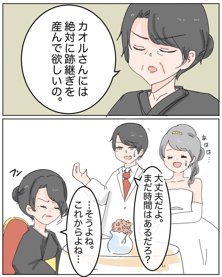 「カオルさんには絶対に跡継ぎを産んで欲しいの」義母にそう言われ、「あはは・・」と笑うしかない私。「大丈夫だよ。まだ時間はあるだろ?」となだめるように言うつかさに、「・・そうよね。これからよね」と義母が言いました。