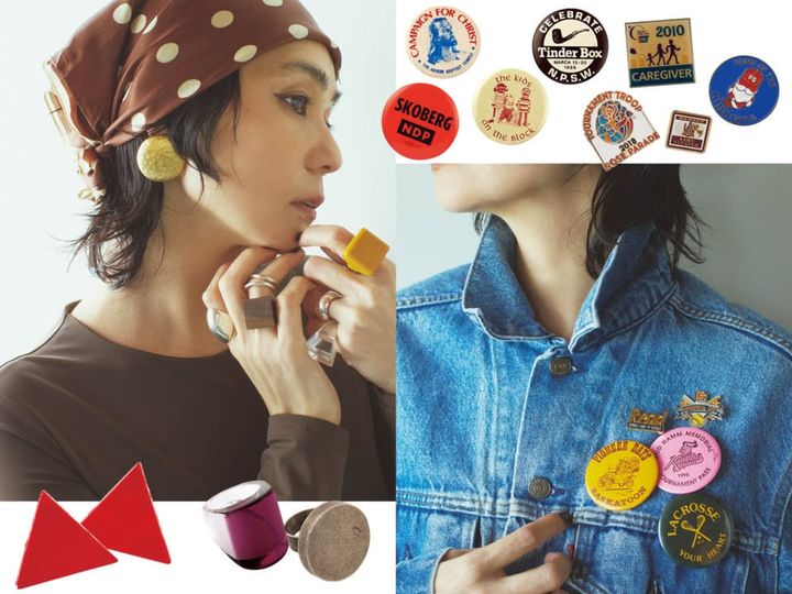 ここ数年人気のブローチやバッジ。実はヴィンテージの缶バッジやピンバッジっておしゃれなものがいっぱい。シンプルな紺ブレやデニムジャケットの胸元に着けるだけで一気に洒落見えするんです。バッグに付けても可愛い。